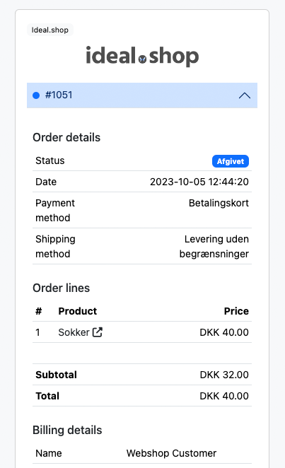 Betalingsstatus og betalingsmetode for alle dine Ideal.shop-ordrer er tilgængelige.