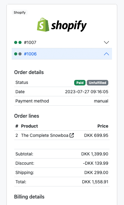 Når du åbner en samtale med kunden, slås kundens e-mail op i Shopify, og alle deres ordrer vises, inklusive betalingsinfo, forsendelsesinfo, sporingslinks osv.