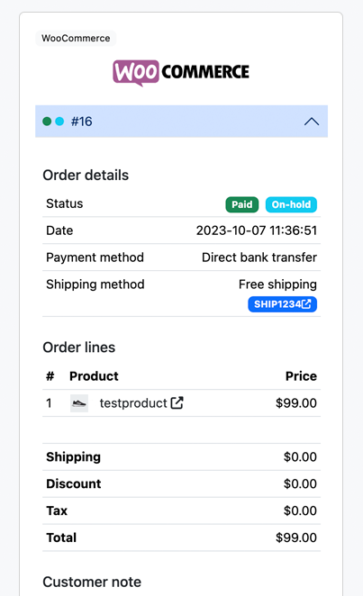 Den gratis WooCommerce-integration er bygget med support til WooCommerce Shipment Tracking. Det betyder, at alle forsendelsessporingskoder og links er let tilgængelige sammen med dine kunders ordrer inde i Herodesk.