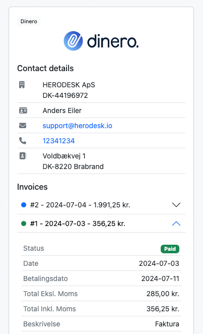 When you open a conversation with a customer, Herodesk automatically looks up their email in Dinero and displays all their details and invoices directly in the interface.