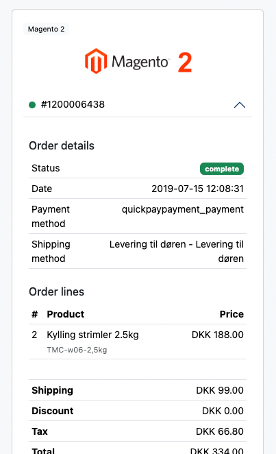 When you open a conversation with the customer, their email is looked up in your Magento webshop, and all their orders are displayed, including payment information, shipping details, status history, and more.
